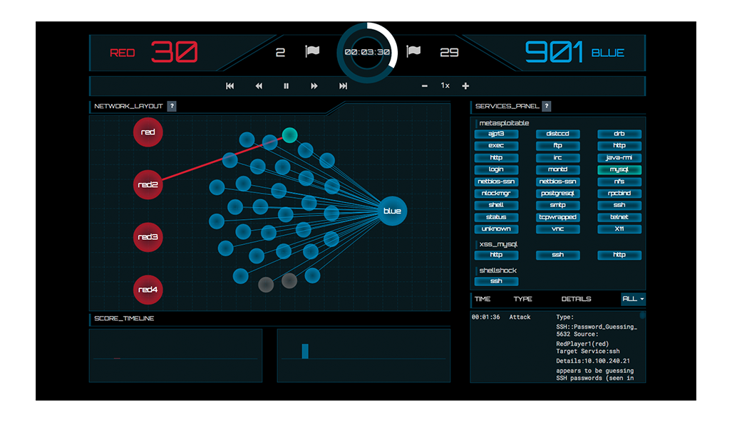 Inspired by "hacker" UI's, monospaced fonts, grids, lines, and transparencies are used to create suspense, urgency and importance in the scoreboard. The GUI tracks gameplay as red players hack and take down services (grey) while blue players restore breached services (turquoise).