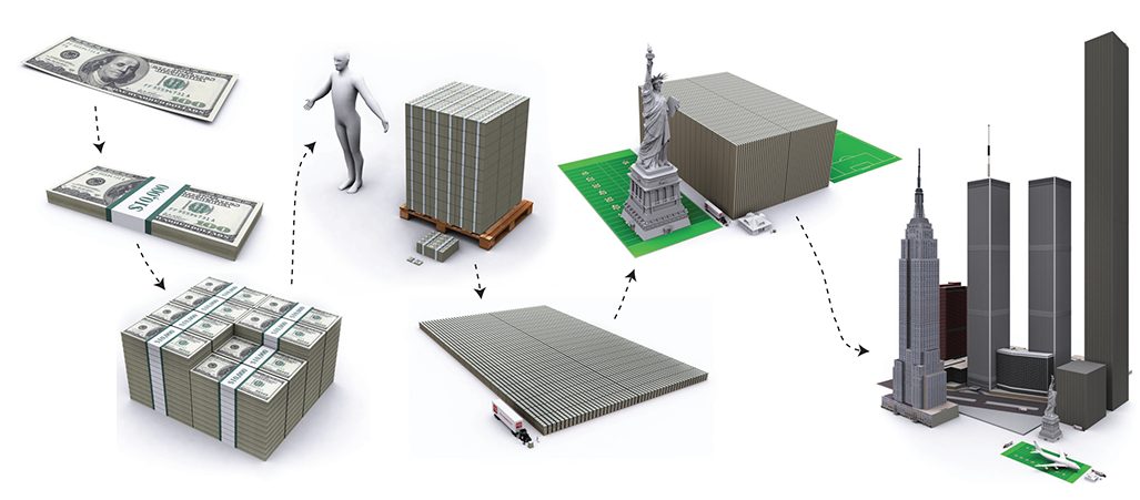 From financial statistics to nutritional values, we are frequently exposed to quantitative information expressed in measures of either extreme magnitudes or unfamiliar units, or both. A common practice used to comprehend such complex measures is to relate, re-express, and compare them through visual depictions using magnitudes and units that are easier to grasp. Through this practice, we create a new graphic composition that we refer to as a concrete scale.