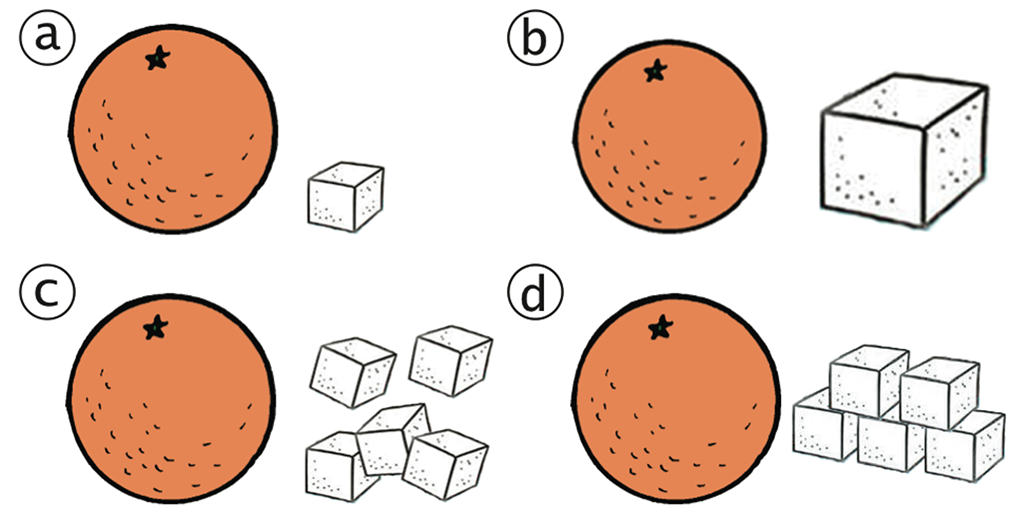 Examples of graphic composites involving pictorial representations of real objects without notations. (a) The relative size of the orange and sugar cube is preserved (b) The relative size is not preserved (c) The orange is juxtaposed to several sugar cubes (d) Rearranged the cubes to make them easily countable.