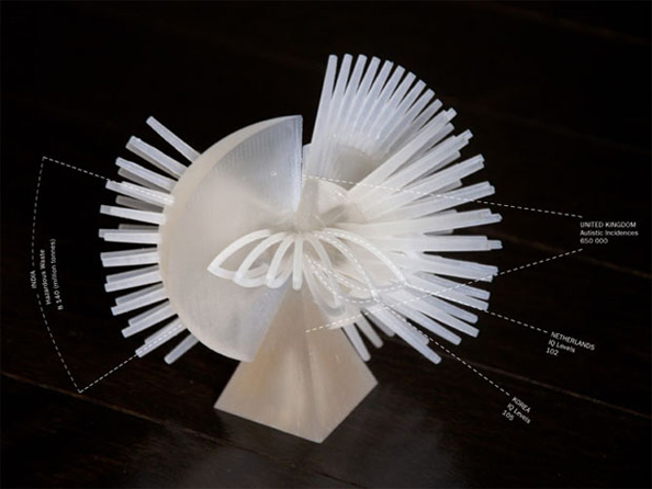 Three datasets revolving around autism statistics from 20 countries were used to dictate the circumference, length, height, width, and other dimensions of each geometry. Hence, the pieces itself are direct translation of statistical information, embedding data into 3D pieces in a tangible and interactive way.